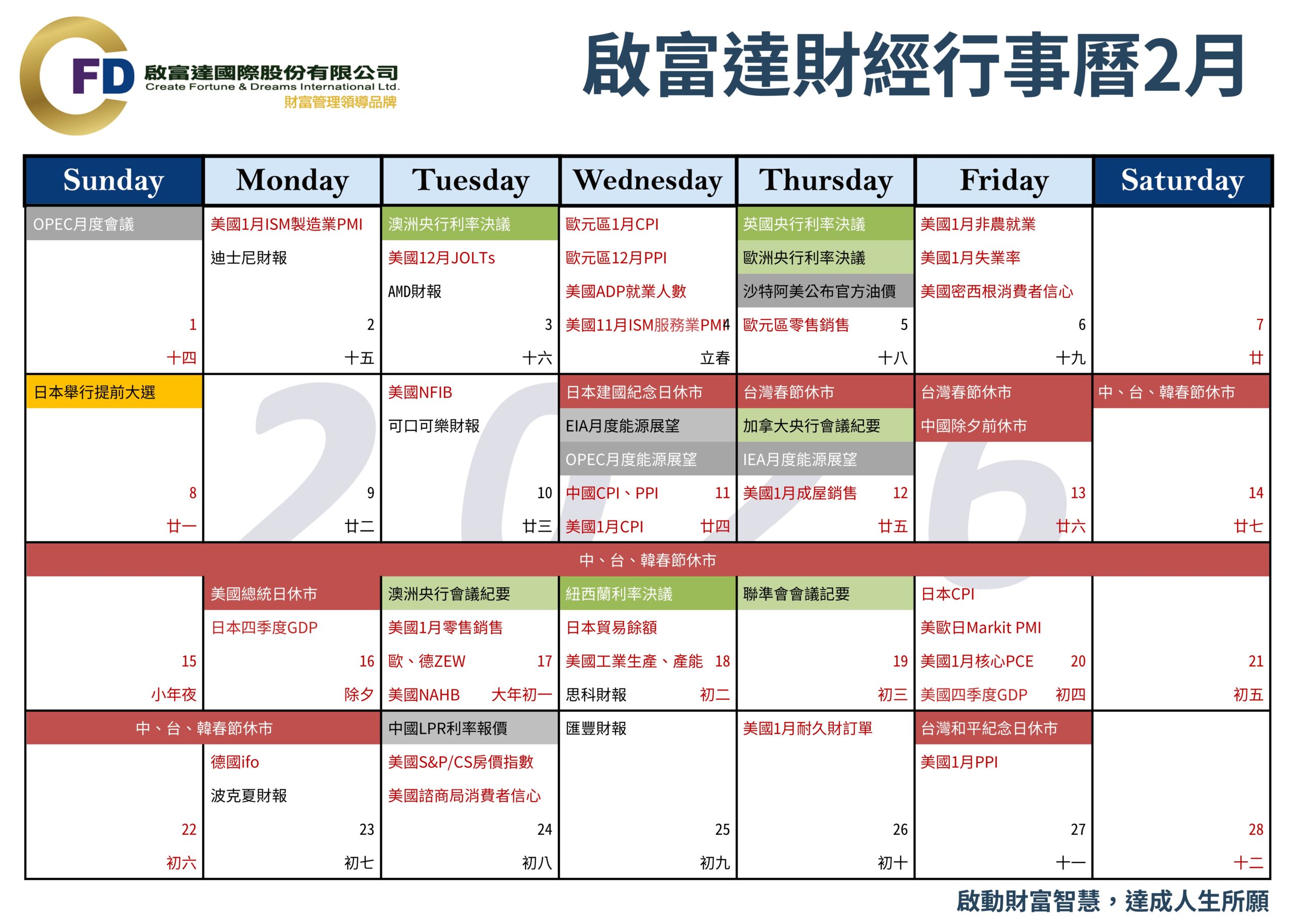 啟富達2026年2月份財經行事曆