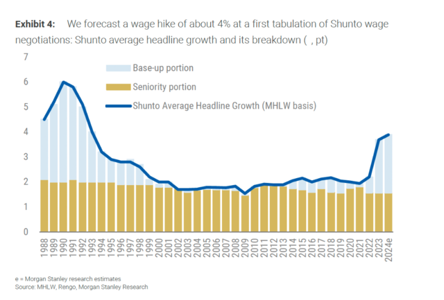 摩根士丹利指出,由於大型企業預計將於3月13日提交其在春季工資談判中的結果,因此在3月的政策會議(3月18-19 日)之前,工資的總體趨勢應該會很明顯: