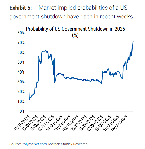 美國政府關門風險正在上升,摩根士丹利認為這對美元構成潛在利空。 Polymarket市場數據顯示,政府關門概率近期明顯上升,這可能進一步增加美元的風險溢價。