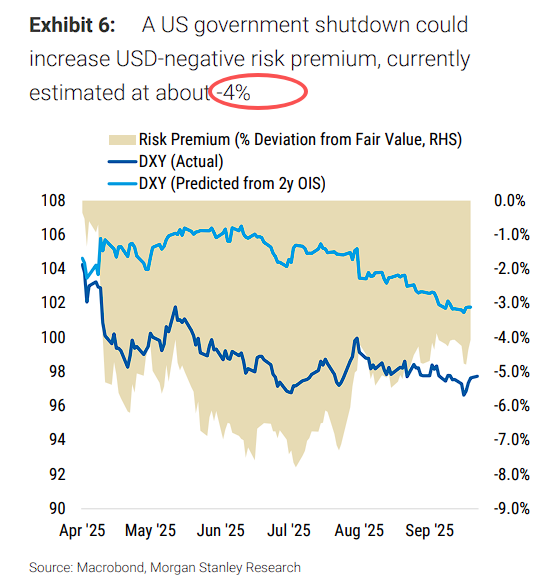 當前美元的負風險溢價約為-4%,政府關門可能推高這一數值。 更重要的是,關門意味著政府數據發佈暫停,這將使美聯儲在10月29日會議前獲得的經濟數據減少。