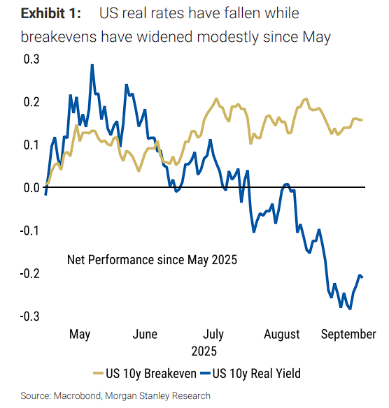 摩根士丹利在年中展望中曾預測美元將持續走弱,但當時預期最可能的市場機制是「防禦機制」,即實際利率和盈虧平衡點同時下降。