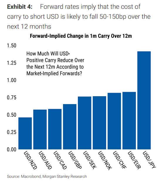 遠期利率顯示,對於大多數貨幣,做空美元頭寸的“成本”將在某個時間點降低50-75個基點,對美元/日元而言接近150個基點。