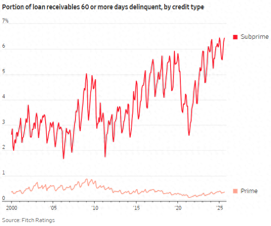 財經博客網站zerohedge此前就表示,隨著一家大型次級汽車貸款機構(Tricolor)以史詩級方式突然撞牆崩塌,美國消費支出強勁的皇帝新衣正被揭開,更多證據正表明美國人當前生活在K型經濟(分化現象明顯)中,且分化正在加劇……