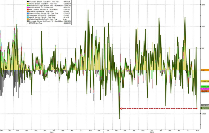 周五比特幣一度下跌5%,使其11月累計跌幅擴大至20%左右。周四比特幣ETF更是遭遇了自成立以來第二大資金流出。