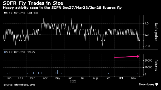在槓桿化期貨市場中,交易員們已經開始推演各種情景,週一一項SOFR期貨蝶式結構出現了一名巨量買家,是一年多以來該結構規模最大的交易。 隨著交易員為進一步降息做準備,近期交易時段中,3個月、6個月和12個月SOFR利差相關的交易活動也頗為活躍。
