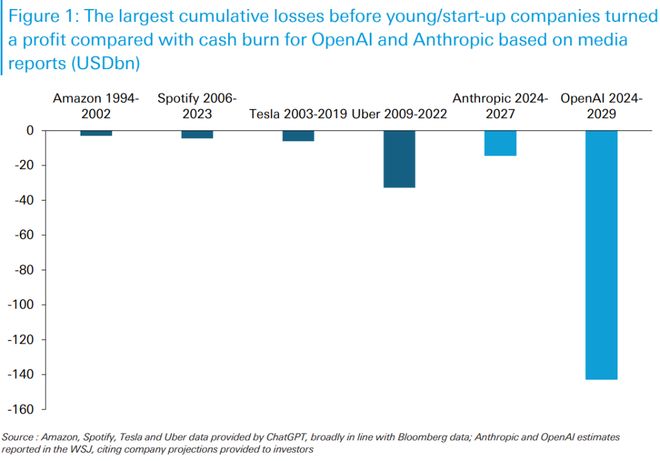 為了更直觀地理解OpenAI的處境,Jim Reid將其預期的虧損與歷史上其他初創公司在盈利前的累計虧損進行了比較。報告指出,OpenAI的預期「燒錢」規模,以及其競爭對手Anthropic的預期虧損,都遠遠超過了歷史記錄。