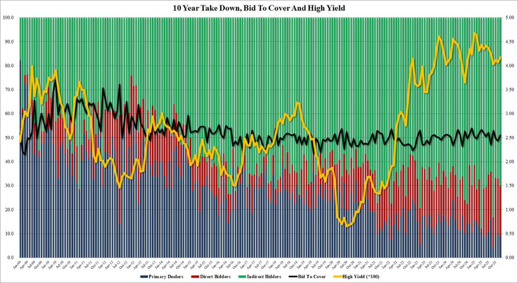 (2009–2025年美國10年期國債拍賣結構與需圖,柱狀圖為三類買家認購佔比,黑線為投標認購倍數,黃線為最高中標利率)