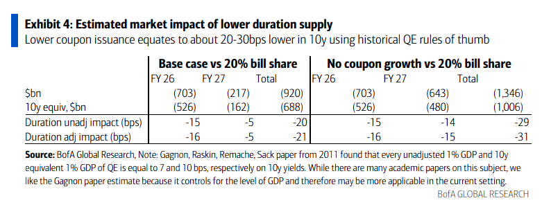 根據測算,在2026和2027財年,較高的國庫券發行情形將比降至20%國庫券佔比的情形減少7000億至1萬億美元的10年期等價供給。 這種供給結構的差異將轉化為10年期利率20-30個基點的凈寬鬆效應。