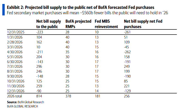 研報稱,美聯儲本月開始實施RMPs計劃,雖然這並非傳統意義上的QE,但通過間接方式允許財政部增加短期國庫券發行,同時減少中長期債券供給。 美銀預計,2026年美聯儲將通過RMPs和MBS再投資總計購買5600億美元國庫券,與此同時財政部計劃增發5000億美元國庫券,減少6000億美元中長期債券發行。
