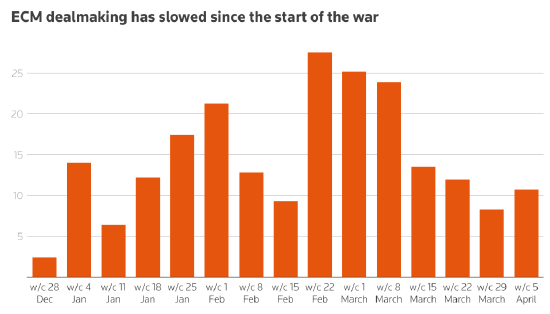 LSEG數據顯示,在衝突開始後立即迎來的「豐收」兩周內,全球達成近500億美元的交易后,股權資本市場(ECM)交易的步伐有所放緩。 截至4月14日的一年中,全球ECM交易額達到2,150億美元,比去年同期增長37%。