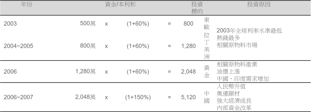 2003年景氣復甦,全球利率水準最低,市場熱錢最多相關原物料市場興起,選擇東歐當成投資主流,資金投入500萬,獲利60%,本利和共800萬即獲利了結;轉投資至號稱美國後花園的拉丁美洲(拉丁美洲-盛產原物料)800萬資金,獲利60%,本利和共1280;再投資黃金,獲利60%;之後再投資下一個主流市場-中國,累積資金已達5000萬以上(圖表列示)。