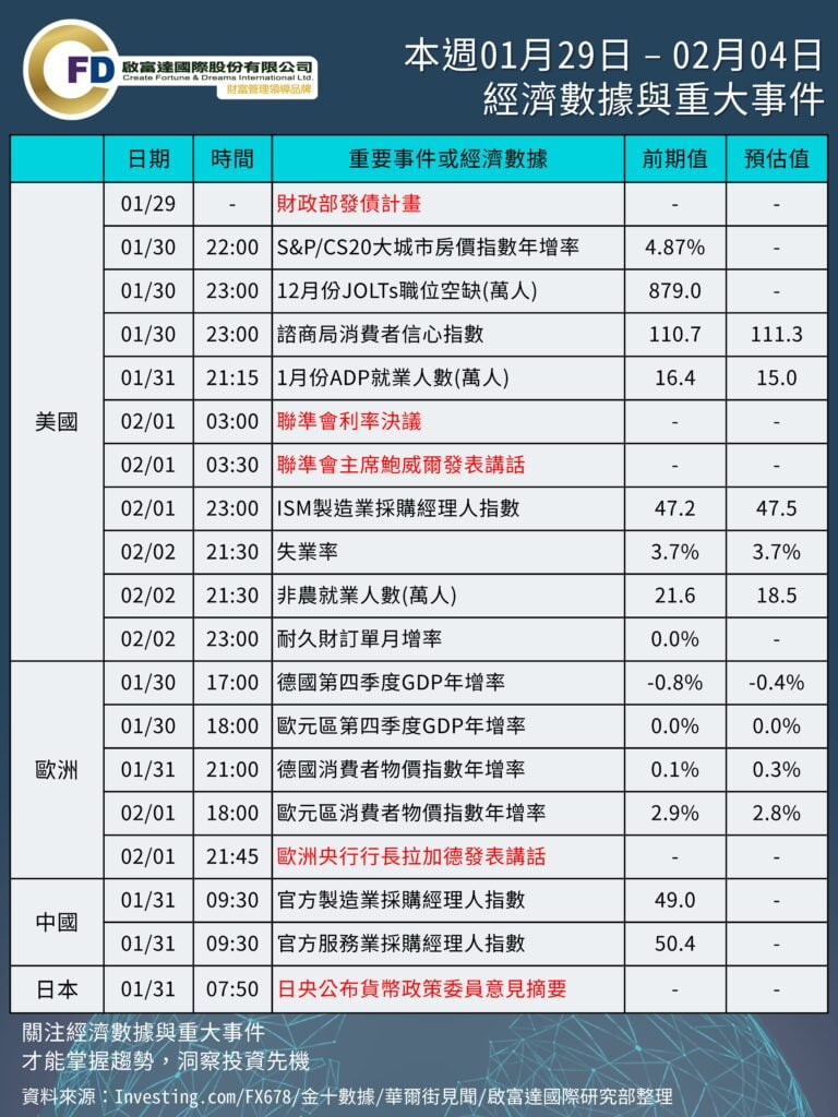。02/01 (四) 聯準會利率決議、聯準會主席鮑威爾發表講話、歐洲央行行長拉加德發表講話