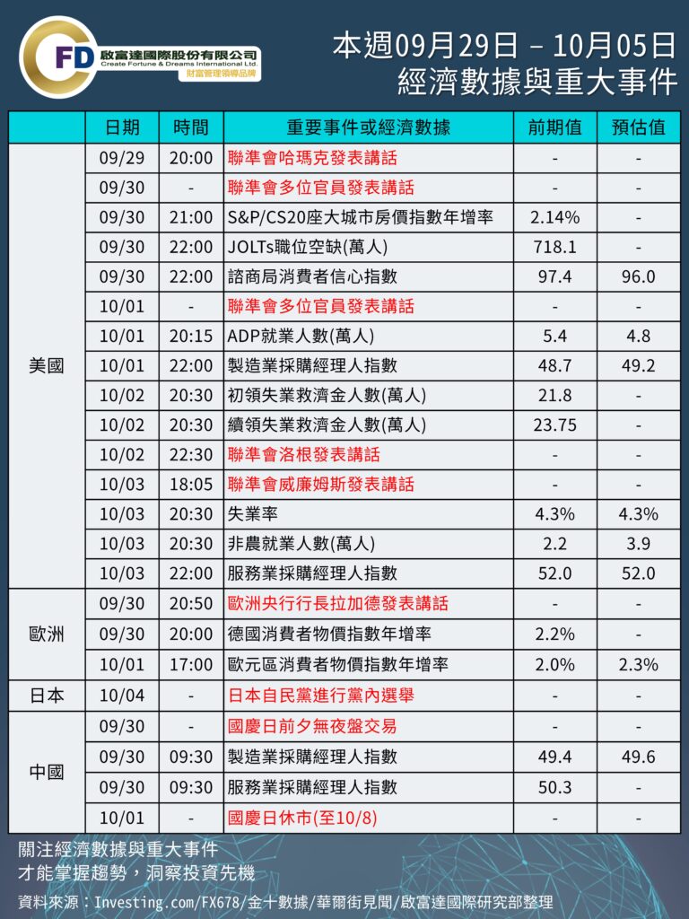 。10/01 (三) 聯準會多位官員發表講話、中國國慶日休市(至10/8)