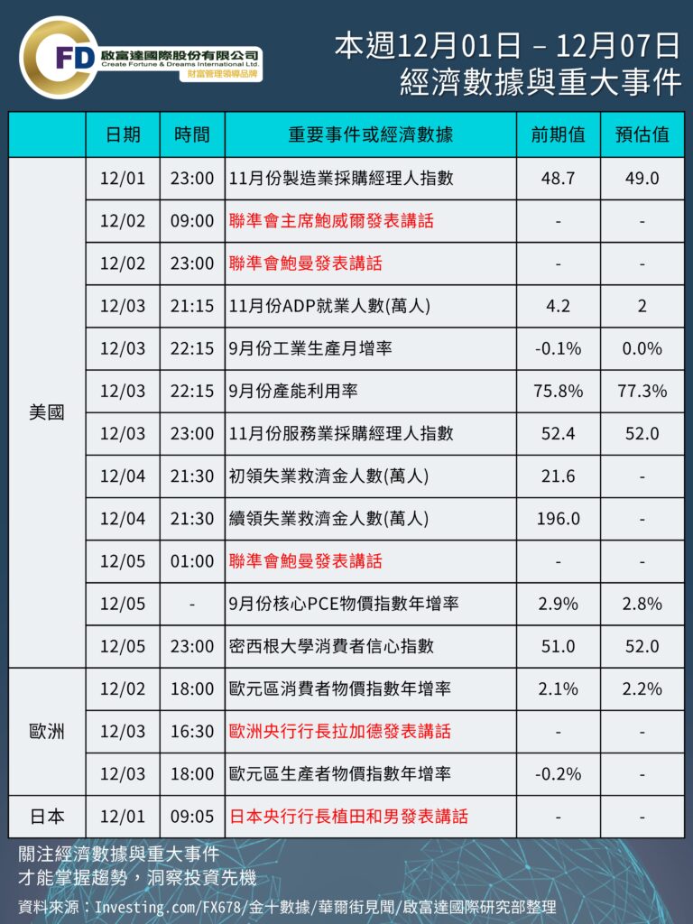。12/03 (三) 美國11月ADP、9月工業生產、產能利用率、11月服務業PMI、歐元區PPI