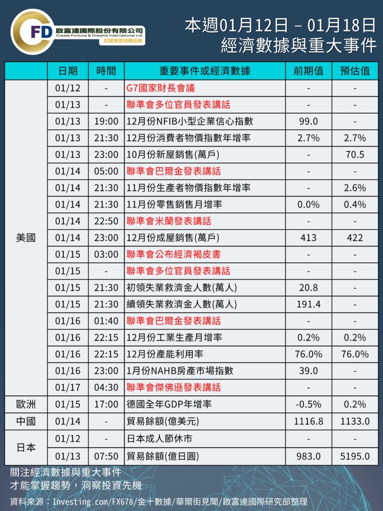 。01/13 (二) 美國NFIB、CPI、新屋銷售、日本貿易餘額