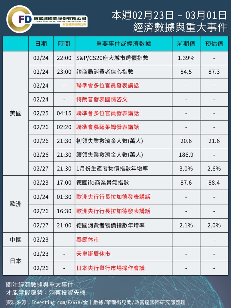 特朗普將發表國情咨文,同時將「全球關稅」加碼至15%於2月24日生效;德國總理默茨或於24日至26日訪華。 AI巨頭英偉達及百度發布重磅財報;蘋果年度股東會與iOS 26.4測試版發佈在即。此外,伊朗局勢、聯準會官員講話、中國LPR及香港財政預算案等事件也值得關注。