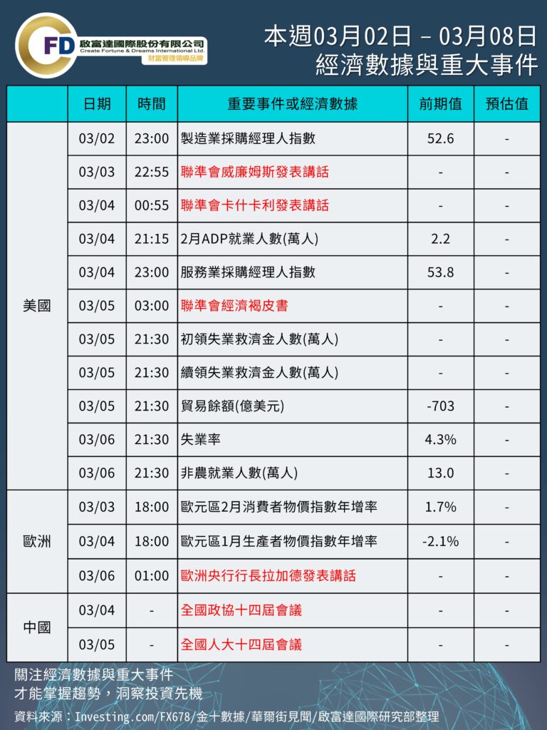 本週 03/02 – 03/08 重要事件與數據