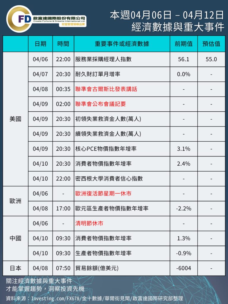 。04/06 (一) 中國清明節休市、歐洲復活節休市